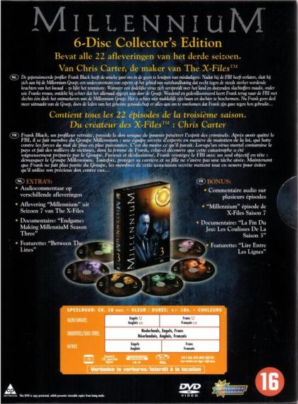 De gepensioneerde profiler Frank Black heeft de unieke gave om in de geest te kruipen van misdadigers. Nadat hij de FBI heeft verlaten, sluit hij zich aan bij de Millennium Groep; een undercoverteam van experts op het gebied van wetshandhaving dat vecht tegen de steeds sterker wordende krachten van het kwaad - zo lijkt het tenminste. Wanneer een dodelijk virus zicht verspreidt over het land en duizenden slachtoffers maakt, onder wie Franks vrouw, ontdekt hij echter dat het allemaal opgezet was door de Groep. Woedend en gedesillusioneerd keert Frank terug naar de FBI met slechts een doel: het ontmaskeren van de Millennium Groep. Het is echter niet makkelijk zijn baan en dochter te beschermen. Nu Frank geen deel meer uitmaakt van de Groep, doen de leden van het geheime genoodschap er alles aan om te voorkomen dat Frank zijn gave tegen hen gebruikt....Het derde seizoen heeft de volgende afleveringen: 301. The Innocents (Part 1) 302. Exegesis (Part 2) 303. TEOTWAWKI 304. Closure 305. ...Thirteen Years Later 306. Skull and Bones 307. Through a Glass Darkly 308. Human Essence 309. Omerta 310. Borrowed Time 311. Collateral Damage 312. The Sound of Snow 313. Antipas 314. Matryoshka 315. Forcing the End 316. Saturn Dreaming of Mercury 317. Darwin's Eye 318. Bardo Thodol 319. Seven and One 320. Nostalgia 321. Via Dolorosa (Part 1) 322. Goodbye to All That (Part 2)