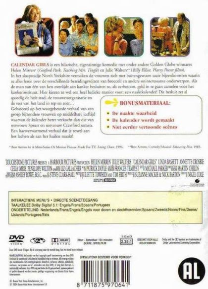 CALENDAR GIRLS is een hilarische, eigenzinnige komedie met onder andere Golden Globe winnares Helen Mirren* (Gosford Park, Teaching Mrs. Tingle) en Julie Walters** (Billy Elliot, Harry Potter films). In het slaapstadje North Yorkshire vermaken de vrouwen zich met buitengewoon saaie bijeenkomsten waarin ze alles leren over de verschillende bereidingswijzen van broccoli en andere oninteressante onderwerpen. Als de man van één van hen overlijdt aan kanker besluiten ze, als eerbetoon, geld te gaan inzamelen voor het kankerinstituut. Hier kiezen ze wel een heel ludieke manier voor: een naaktkalender! Dit besluit zet al spoedig de hele stad, de vrouwenorganisatie en de rest van het land in rep en roer... Gebaseerd op het waargebeurde verhaal van een groep bijzondere vrouwen op middelbare leeftijd waarvan de kalender beter verkocht dan die van mevrouw Pears en mevrouw Crawford samen. Een hartverwarmend verhaal dat je zowel aan het lachen als aan het huilen maakt!* Best Actress In A Mini-Series Or Motion Picture Made For TV, Losing Chase, 1996** Best Actress, Comedy/Musical, Educating Rita, 1983