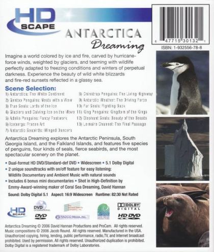 Imagine a world colored by ice and fire, carved by hurricane-force winds, weighted by glaciers, and teeming with wildlife perfectly adapted to freezing conditions and winters of perpetual darkness. Experience the beauty of wild white blizzards and fire-red sunsets reflected in a glassy sea.Antarctica Dreaming explores the Antarctic Peninsula, South Georgia Island, and the Falkland Islands, and features five species of penguins, four kinds of seals, fierce seabirds, and the most spectacular scenery on the planet.