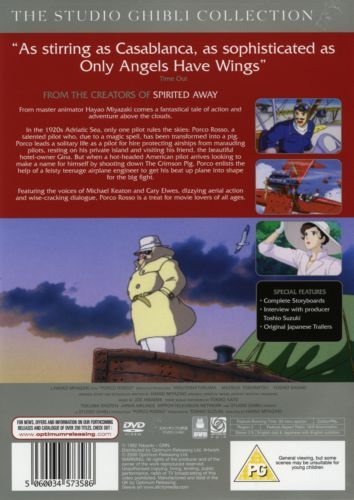 From master animator Hayao Miyazaki comes a fantastical tale of action and adventure above the clouds.In the 1920s Adriatic Sea, only one pilot rules the skies: Porco Rosso, a talented pilot who, due to a magic spell, has been transformed into a pig. Porco leads a solitary life as a pilot for hire protecting airships from marauding pilots, resting on his private island and visiting his friend, the beautiful hotel-owner Gina. But when a hot-headed American pilot arrives looking to make a name for himself by shooting down The Crimson Pig, Porco enlists the help of a feisty teenage airplane engineer to get his beat up plane ito shape for the big fight.Featuring the voices of Michael Keaton and Cary Elwes, dizzying aerial action and wise-cracking dialogue, Porco Rosso is a treat for movie lovers of all ages.