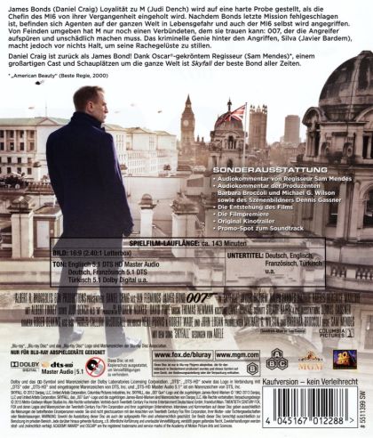 James Bonds (Daniel Craig) Loyalität zu M (Judi Dench) wird auf eine harte Probe gestellt, als die Chefin des MI6 von ihrer Vergangenheit eingeholt wird. Nachdem Bonds letzte Mission fehlgeschlagen ist, befinden sich Agenten auf der ganzen Welt in Lebensgefahr und auch der MI6 selbst wird angegriffen. Von Feinden umgeben hat M nur noch einen Verbündeten, dem sie trauen kann: 007, der die Angreifer aufspüren und unschädlich machen muss. Das kriminelle Genie hinter den Angriffen, Silva (Javier Bardem), macht jedoch vor nichts Halt, um seine Rachegelüste zu stillen.Daniel Craig ist zurück als James Bond! Dank Oscar®-gekröntem Regisseur (Sam Mendes)*, einem großartigen Cast und Schauplätzen um die ganze Welt ist Skyfall der beste Bond aller Zeiten.* „American Beauty“ (Beste Regie, 2000)