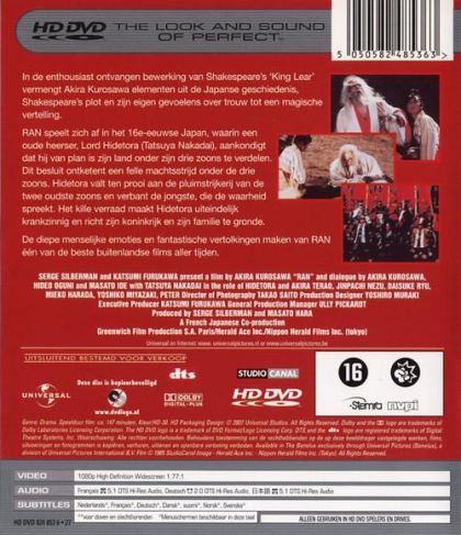 In de enthousiast ontvangen bewerking van Shakespeare’s ‘King Lear’ vermengt Akira Kurosawa elementen uit de Japanse geschiedenis, Shakespeare’s plot en zijn eigen gevoelens over trouw tot een magische vertelling. RAN speelt zich af in het 16e-eeuwse Japan, waarin een oude heerser, Lord Hidetora (Tatsuya Nakadai), aankondigt dat hij van plan is zijn land onder zijn drie zoons te verdelen. Dit besluit ontketent een felle machtsstrijd onder de drie zoons. Hidetora valt ten prooi aan de pluimstrijkerij van de twee oudste zoons en verbant de jongste, die de waarheid spreekt. Het kille verraad maakt Hidetora uiteindelijk krankzinnig en richt zijn koninkrijk en zijn familie te gronde. De diepe menselijke emoties en fantastische vertolkingen maken van RAN één van de beste buitenlandse films aller tijden.