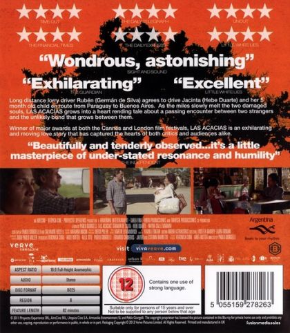 Long distance lorry driver Rubén (Germán de Silva) agrees to drive Jacinta (Hebe Duarte) and her 5 month old child en route from Paraguay to Buenos Aires. As the miles slowly melt the two damaged souls, LAS ACACIAS grows into a heart rending tale about a passing encounter between two strangers and the unlikely bond that grows between them.Winner of major awards at both the Cannes and London film festivals, LAS ACACIAS is an exhilirating and moving love story that has captured the hearts of both critics and audiences alike.