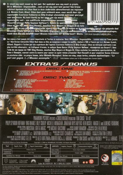 J.J. Abrams vliegt mee met stuntvliegerSelecteer op de eerste menu-pagina van de tweede disc de regel 'Mission: Metamorphosis' en druk dan op de NAAR RECHTS-button op je afstandsbediening. De geluidsgolven van de video stream lichten nu op. Druk ENTER voor een kort filmpje waarin regisseur J.J. Abrams even meevliegt met een stuntvlieger.Behind-the-scenes bij de Vaticaan-scèneSelecteer op de tweede menu-pagina van de tweede disc de regel 'Theatrical Trailers' en druk dan op de NAAR RECHTS-button op je afstandsbediening. De geluidsgolven van de video stream lichten nu op. Druk ENTER voor een kort, doch swingend kijkje achter de schermen van de Vaticaan-scène.Acteur Dermot Mulroney speelt celloGa op de tweede disc naar het 'Theatrical Trailers' submenu. Selecteer de regel 'Teaser Trailer' en druk dan op de NAAR RECHTS-button op je afstandsbediening. Er licht een IMF-logo op. Druk ENTER voor een kort interview met acteur Dermot Mulroney, die chello speelt op de soundtrack van de film.Emmy-nomaties voor 'Lost'Ga op de tweede disc naar het 'TV Spots' submenu. Selecteer de regel 'New Escape' en druk dan op de NAAR RECHTS-button op je afstandsbediening. Er licht een IMF-logo op. Druk ENTER voor een filmpje waar J.J. Abrams op de set van 'M:I:III' te horen krijgt dat 'Lost' genomineerd werd voor maar liefst twaalf Emmy-nominaties.