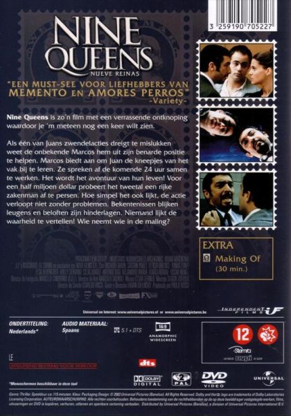 Nine Queens is zo'n film met een verrassende ontknoping waardoor je 'm meteen nog een keer wilt zien.Als één van Juans zwendelacties dreigt te mislukken weet te onbekende Marcos hem uit zijn benarde positie te helpen. Marcos biedt aan om Juan de kneepjes van het vak bij te leren. Ze spreken af de komende 24 uur samen te werken. Het wordt het avontuur van hun leven! Voor een half miljoen dollar probeert het tweetal een rijke zakenman af te persen. Hoe simpel het ook lijkt, de actie verloopt niet zonder problemen. Bekentenissen blijken leugens en beloftes zijn hinderlagen. Niemand lijkt de waarheid te vertellen! Wie neemt wie in de maling?