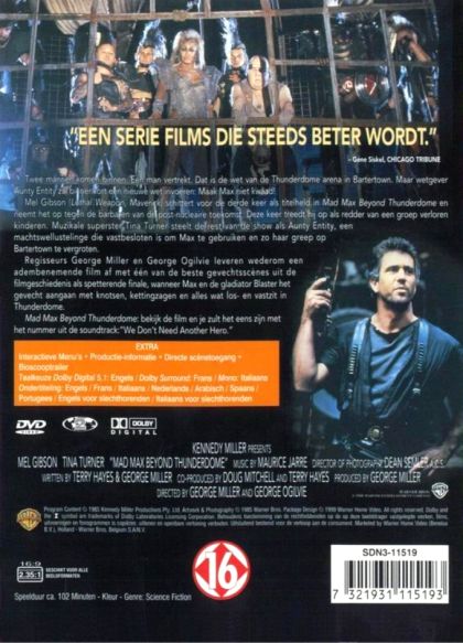 Twee mannen komen binnen. Eén man vertrekt. Dit is de wet van de Thunderdome arena in Bartertown. Maar wetgever Aunty Entity zal binnenkort een nieuwe wet invoeren: Maak Max niet kwaad!Mel Gibson (Lethal Weapon, Maverick) schittert voor de derde keer als titelheld in Mad Max Beyond Thunderdome en neemt het op tegen de barbaren van de post-nucleaire toekomst. Deze keer treedt hij op als redder van een groep verloren kinderen. Muzikale superster Tina Turner steelt de rest van de show als Aunty Entity, een machtswellustelinge die vastbesloten is om Max te gebruiken en zo haar greep op Bartertown te vergroten.Regisseurs George Miller en George Ogilvie leveren wederom een adembenemende film af met één van de beste gevechtsscènes uit de filmgeschiedenis als spetterende finale, wanneer Max en de gladiator Blaster het gevecht aangaan met knotsen, kettingzagen en alles wat los- en vastzit in Thunderdome.Mad Max Beyond Thunderdome: bekijk de film en je zult het eens zijn met het nummer uit de soundtrack: "We Don't Need Another Hero".