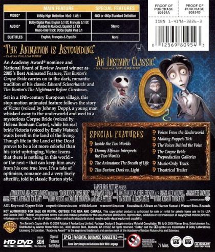 An Academy Award® nominee and National Board of Review Award winner as 2005's Best Animated Feature, Tim Burton's Corpse Bride carries on in the dark, romantic tradition of his classic Edward Scissorhands and Tim Burton's The Nightmare Before Christmas.Set in a 19th-century European village, this stop-motion animated feature follows the story of Victor (voiced by Johnny Depp), a young man whisked away to the underworld and wed to a mysterious Corpse Bride (voiced by Helena Bonham Carter), while his real bride Victoria (voiced by Emily Watson) waits bereft in the land of the living. Though life in the Land of the Dead proves to be a lot more colorful than his strict upbringing, Victor learns that there is nothing in this world - or the next - that can keep him away from his one true love. It's a tale of optimism, romance and a very lively afterlife, told in classic Burton style.
