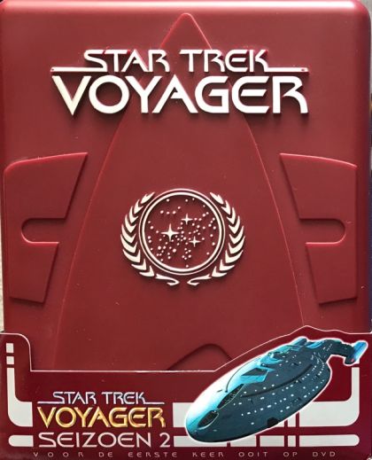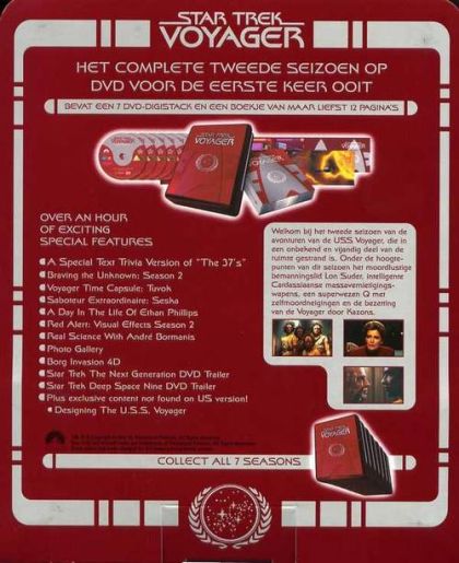 STARTREK - VOYAGER - SEIZOEN 2DISK 1The 37's - 020 - 48975.1Wanneer ze in de ruimte een oude Ford-pickup-auto vinden, gaat Voyager op onderzoek uit en landen ze wat later op een bewoonde planeet. Hier ontdekken ze een beschaving van aardbewoners die in't jaar 1937 door buitenaardse wezens ontvoerd werden en hierheen gevoerd werden!Initiations - 021 - 49005.3Wanneer een jonge Kazon niet slaagt in zijn pogingen om Chacotay te vermoorden, kan hij geen naam maken als krijger. Chacotay krijgt wel zijn vrijheid aangeboden op voorwaarde dat hij deze jonge 'mislukkeling' ter dood brengt, wat hier tegen elk menselijk gevoel indruist!Projections - 017 - 48892.1Na een ongeval ontdekt de dokter dat hij geen onderscheid meer kan maken tussen illusie en werkelijkheid. Dit komt wel heel erg lastig uit als hij luitenant Reginald Barclay ontmoet die de dokter wijsmaakt dat hij zich enkel kan redden door de Voyager te vernietigen!Elogium - 018 - 48921.3In de ruimte levende organismen verstoren nu het levensritme van het lichaam van Kes, de Ocampa. Volkomen onverwacht nu komt ze plots in haar 'Elogium'-fase terecht, waarin ze vruchtbaar wordt.Als Kes ooit 'n kind zou willen krijgen, moet ze er nu meteen iets aan gaan doen!DISK 2Non Sequitur - 022 - 49011.0Wanneer Harry Kim opeens ontwaakt in het San Fransisco van de 24-ste eeuw is hij verward als alleman om hem heen dit als normaal ervaart. Nog erger wordt het als hij in geen enkel starfleet-dossier blijkt voor te komen. Niemand buiten hem weet iets af van de Voyager-reis! Twisted - 019 - UnknownEen vervormende ruimte-golf brengt het gehele interieur van Voyager in de war en verandert willekeurig de inrichting van kamers,zalen en dekken van het gehele schip.Al snel begrijpt men dat er hier een onbekende mysterieuze kracht aan het werk is, met dodelijke gevolgen!!Parturition - 023 - 49068.5Neelix en Paris komen regelmatig in conflict met elkaar door hun gezamelijke liefde voor Kes. Na enkele wrijvingen stuurt Janeway deze twee kemphanen samen op een away-missie naar een onbekende planeet. Buiten planetaire gevaren, is er nu ook hun wederzijdse achterdocht!Persistence of Vision - 024 - UnknownOp doktersadvies gaat Janeway wat ontspanning zoeken in het holodek. Ze wordt echter nog meer verward als blijkt dat enkele holodek-visioenen haar doorheen het gehele schip volgen. Ook anderen krijgen gelijkaardige problemen, maar dan ontdekt men wat hier achter steekt !DISK 3Tattoo - 025 - UnknownTerwijl de dokter probeert om empathie te ervaren, en zich nu daarom vrijwillig besmet heeft met een sterke dosis Levodiaanse griep, kucht en hoest hij dagen lang. Ondertussen ontdekt Chacotay op 'n onbekende planeet een symbool dat hij nog kent vanuit zijn jeugd op aarde!Cold Fire - 026 - 49164.8Ondanks een vijandige reaktie vanuit een door Ocampa's bezet ruimte-station, maakt de Voyager contact met hen en hun metgezel,een vrouwelijke 'caretaker'. Die bezit het vermogen om de hele Voyager binnen een seconde naar huis te zenden, maar zal ze dit nu wel willen doen? Maneuvers - 027 - 49211.5Janeway wordt door een vals Federatie-signaal in een val gelokt, en ontdekt dat een onbetrouwbare overloper, Seska, nu samenwerkt met de leiders van een plaatselijke Kazon-fractie. Dit is het begin van een erg angstige strijd die voor Chacotay een erg schokkend einde heeft!Resistance - 028 - UnknownTijdens een away-missie worden enkele van Janeway's officieren ontvoerd door het aggressieve volk der Mokra's. Janeway zelf wordt ook ontvoerd en verborgen gehouden door een exentrieke man die er om een of andere reden ervan overtuigd is dat Janeway z'n eigen dochter is!DISK 4Prototype - 029 - UnknownWanneer Belanna Torres een defekte Alien-robot vindt, slaagt zij erin om deze weer in orde te krijgen. Als zij dan ook nog ontdekt dat deze robot erg veel 'broers' en 'zusters' heeft, zal zij alles doen om deze robot dupliceer-mogelijkheden te geven, een erg slecht idee!Alliances - 031 - 49337.4Na de dood van drie bemanningsleden is Janeway gedwongen om meer en meer als een Kazon-leider te gaan denken. Ze neemt contact op met de Kazon en stelt onderhandelingen voor met de verschilllende fracties. Tijdens dit alles wordt op de Voyager een tweede verrader ontdekt !Threshold - 032 - 49373.4Na een wetenschappelijke doorbraak is Tom Paris opeens in staat om met een shuttle sneller te vliegen dan de zogenaamd ondoordringbare snelheidsgrens van warp tien! Helaas zijn de mentale en de fysieke gevolgen zo zwaar dat de hele Voyager in groot gevaar terecht komt!Meld - 033 - UnknownTuvok is na een zinloze moord aan boord totaal in de war. Zijn logische geest is niet in staat om zulk een daad te begrijpen, en daarom besluit hij tot een geestes-versmelting met de dader. Dit had hij nu beter niet gedaan want ook hij krijgt plots aggressieve neigingen !!DISK 5:Dreadnought - 034 - 49447.0Torres ontmoet 'n verdwaald intelligent wapen dat nu ooit in een ver verleden door Cardassians gelanceerd werd. Nog steeds is dit tuig onderweg naar zijn geprogrammeerde doel. Onze Klingon-technicus zal alles in het werk stellen om dit wapen veilig te kunnen demonteren ! Death Wish - 030 - 49301.2In een zwervende komeet wordt een Q-wezen ontdekt dat meteen de wens uit om te mogen sterven! Onze oude bekende Q duikt ook op en Janeway is gedwongen om een rechtszitting te organiseren omtrent deze vraag tot eutanasie.Diverse mensen uit 't verleden duiken als getuigen op!Lifesigns - 036 - 49504.3De dokter krijgt een Vidiaanse vrouw als patient, die aan vergevorderde 'phage' lijdt.Hij geeft haar een holografisch lichaam en wordt prompt verliefd op haar. Zij moet nu echter kiezen tussen 'n gezond, maar erg kort leven,of een langer als zwaar zieke terminale patient!Investigations - 035 - 49485.2Neelix zoekt interessante gebeurtenissen voor z'n dagelijkse nieuwsuitzendingen. Hij interviewt nu zowat iedereen en onthult dat Paris binnen een paar dagen de Voyager wil verlaten.Verder onderzoek jaagt nu alweer een nieuwe verrader vanuit zijn schuilpl