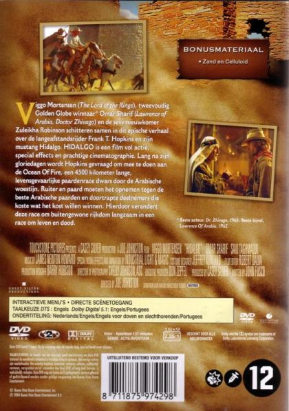 Viggo Mortensen (The Lord of the Rings), tweevoudig Golden Globe winnaar Omar Sharif (Lawrence of Arabia, Doctor Zhivago) en de sexy nieuwkomer Zuleikha Robinson schitteren samen in dit epische verhaal over de langeafstandsrijder Frank T. Hopkins en zijn mustang Hidalgo. HIDALGO is een film vol actie, special effects en prachtige cinematographie. Lang na zijn gloriedagen wordt Hopkins gevraagd om mee te doen aan de Ocean of Fire, een 4500 kilometer lange, levensgevaarlijke paardenrace dwars door de Arabische woestijn. Ruiter en paard moeten het opnemen tegen de beste Arabische paarden en doortrapte deelnemers die koste wat het kost willen winnen. Hierdoor verandert deze race om buitengewone rijkdom langzaam in een race om leven en dood.