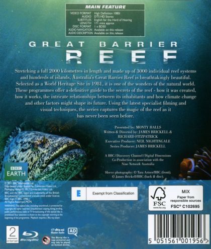 This is a marvellous guide to the Great Barrier Reef. Visually stunning and presented by Monty Halls, a marine biologist, ex-marine and a diver. The series is delivered in three one hour episodes although they flow into each other seamlessly. We are informed that the Reef is over 2000km. long,created after the ice age meltdown and the only living structure on earth that can be seen from space. The reef formed by plankton polyps that form coral colonies that, with a microscopic plant, create a limestone skeleton into which they are embedded, and although only 1% of the ocean the reef is home to 1/4 of all known marine coral life. Halls may be no Attenborough but he is enthusiastic in his underwater diving and clearly delights in this project and its narration, often in close proximity to his subjects (even lying in mud sediment) It is, of course, the breathtaking, crystal clear photography that dominates this winner. Remote mini-cameras and remotely operated vehicles (ROVs) take us to places not previously captured.The food chain from plankton to small fish and increasing sizes of predators are magnificently pictured. The necessity of hiding for protection and the need for dangerous escapades for food are portrayed as a force of nature, from groupers eating algae to to bump-head parrott fish the size of sheep ripping chunks of coral to tiger sharks dismembering and sawing through the shells of turtles. The sheer numbers and variety of sea-life are a veritable kaleidoscope of action. The beautifully coloured coral produced by algae bleaches when exposed to excess heat. Other aspects of the reef and their inhabitants are explored, the lagoons, mangroves, islands and rain forests all graphically shot from the air, ground level or beneath the sea. Wonderful rocks,rivers and waterfalls. The whole package is eye catching. Memorable moments include the green turtle migration to Raine Island where up to 26000 arrive at one time to nest and lay eggs, a slow and hazardous journey, filmed with time-lapse. The hatching of the eggs and young turtles struggling to get to the sea before the herons eat them. The billions of larvae formed from mass migration seeking a home to form a polyp and a coral colony.The spectacular shipwreck scene sheltering over 120 varieties of fish, the largest of its kind in the world. The Queensland grouper the size of a car,venomous jelly fish and sea snakes, sea cows (once mistaken for mermaids) grazing on 40kg sea grass per day. Eagles fabulously caught in flight chasing and catching fruit bats. All shown with total brilliance. Noise from damsel fish and humpback and dwarf minke whales add to the attractions.Halls ends speculating the effects of natural phenomena on the reef: cyclones, global warming, temperature and tidal changes but also the man-made effects: ranches, cattle farms, habitat changes to support agriculture. All affecting the ecosystem and possibly the long-term lucrative tourist industry. This is a fantastic visual experience beautifully photographed and presented. Top star product.