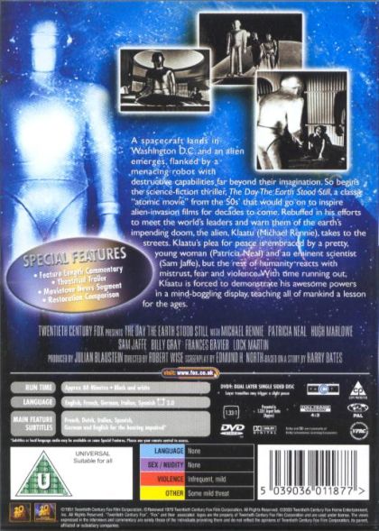 A spacecraft lands in Washington D.C. and an alien emerges, flanked by a menacing robot with destructive capabilities far beyond their imagination. So begins the science-fiction thriller, The Day The Earth Stood Still', a classic "atomic movie" from the 50s' that would go on to inspire alien-invasion films for decades to come. Rebuffed in his efforts to meet the world's leaders and warn them of the earth's impending doom, the alien, Klaatu (Michael Rennie), takes to the streets. Klaatu's plea for peace is embraced by a pretty, young woman (Patricia Neal) and an eminent scientist (Sam Jaffe), but the rest of humanity reacts with mistrust, fear and violence. With time running out, Klaatu is forced to demonstrate his awesome powers in a mind-boggling display, teaching all of mankind a lesson for the ages.