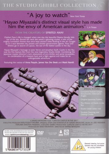Orphan Pazu's life is changed when one day the beautiful Sheeta literally falls out of the sky. Round her neck she wears a glowing crystal, a relic of the mighty Levitation Stones that once kept ancient cities floating in the air. Caught up in a race between sky pirates and sinister government agents, Pazu and Sheeta go in search of Laputa, the last of the fabled castles in the sky.Hayao Miyazaki's homage to Jules Verne and Jonathan Swift, Castle in the Sky was the first feature film from the now legendary Studio Ghibli. Combining the Japanese master director's twin obsessions of eco-thriller and aerial escapades, its combination of a treasure hunt and a fight against evil make for an unforgettable adventure.Featuring the voices of 'Anna Paquin', 'James Van Der Beek', and 'Mark Hamill'.