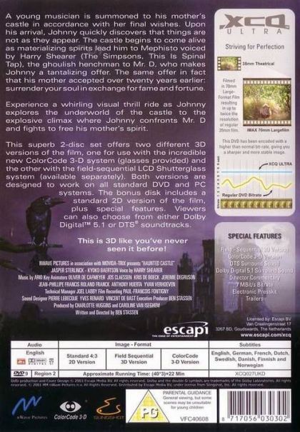 A young musician is summoned to his mother's castle in accordance with her final wishes. Upon his arrival, Johnny quickly discovers that things are not as they appear. The castle begins to come alive as materializing spirits lead him to Mephisto voiced by Harry Shearer (The Simpsons, This Is Spinal Tap), the ghoulish henchman to Mr. D, who makes Johnny a tantalizing offer. The same offer in fact that his mother accepted over twenty years earlier: surrender your soul in exchange for fame and fortune.Experience a whirling visual thrill ride as Johnny explores the underworld of the castle to the explosive climax where Johnny confronts Mr. D and fights to free his mother's spirit.This superb 2-disc set offers two different 3D versions of the film one for use with the incredible new ColorCode 3-D system (glasses provided) and the other with the field-sequential LCD shutterglass system (available separately). Both versions are designed to work on all standard DVD and PC systems. The bonus disk includes a standard 2D version of the film, plus special features. Viewers can also choose from either Dolby Digital or DTS soundtracks.