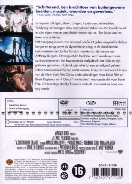 Schoppen, aftuigen, stelen, zingen, tapdansen, verkrachten. Teddyboy en hooligan Alex met bolhoed (Malcolm McDowell) houdt er zijn eigen manier van plezier maken op na. Ten koste van het leven van anderen. Het overgangsproces van amoreel boefje tot gehersenspoelde deftige burger en terug vormt de dynamische boog in de shockerende toekomstvisie die Stanley Kubrick maakte van de roman van Anthony Burgess. Onvergetelijke beelden, verrassende muzikale contrast-elementen, het fascinerende taalgebruik dat Alex en zijn gabbers gebruiken - Kubrick giet alles tot een schokkend geheel. Uiterst controversieel bij zijn eerste release, kreeg A Clockwork Orange van de New York Film Critics onderscheidingen voor Beste Film en Beste Regisseur en 4 Oscar® nominaties, waaronder die voor Beste Film. Dit krachtige staaltje filmkunst verleidt, shockeert en boeit ons nog steeds.