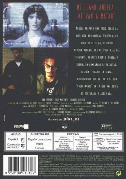 Ángela prepara una tesis sobre la violencia audiovisual. Figueroa, su director de tesis, descubre accidentalmente una película y al día siguiente aparece muerto. Ángela y Chema, un compañero de facultad, deciden llevarse la cinta, descubriendo que se trata de una "snuff-movie" en la que una chica es torturada y asesinada. Un mundo audiovisual diferente y peligroso se abre ante ellos. Ángela puede ser la protagonista de la siguiente "snuff-movie".