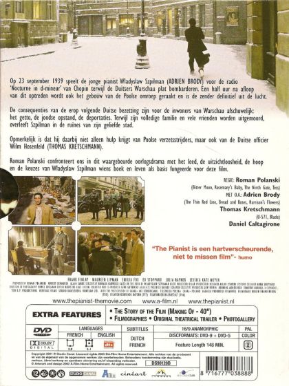 Op 23 september 1939 speelt de jonge pianist Wladyslaw Szpilman (Adrien Brody) voor de radio 'Nocturne in d-mineur' van Chopin terwijl de Duitsers Warschau plat bombarderen. Een half uur na afloop van dit optreden wordt ook het gebouw van de Poolse omroep geraakt en is de zender definitief uit de lucht.De consequenties van de erop volgende Duitse bezetting zijn voor de inwoners van Warschau afschuwelijk: het getto, de joodse opstand, de deportaties. Terwijl zijn volledige familie en vele vrienden worden uitgemoord, overleeft Szpilman in de ruïnes van zijn geliefde stad.Opmerkelijk is dat hij daarbij niet alleen hulp krijgt van Poolse verzetsstrijders, maar ook van de Duitse officier Wilm Hosenfeld (Thomas Kretschmann).Roman Polanski confronteert ons in dit waargebeurde oorlogsdrama met het leed, de uitzichtloosheid, de hoop en de keuzes van Wladyslaw Szpilman wiens boek en leven als basis fungeerde voor deze film.