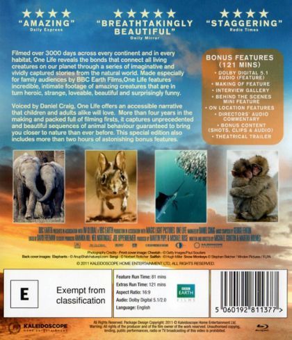 Filmed over 3000 days across every continent and in every habitat, One Life reveals the bonds that connect all living creatures on our planet through a series of imaginative and vividly captivated stories from the natural world. Made especially for family audiences by BBC Earth Films, One Life features incredible, intimate footage of amazing creatures that are in turn heroic, strange, lovable, beautiful and surprisingly funny.Voiced by Daniel Craig, One Life offers an accessible narrative that children and adults alike will love. More than four years in the making and packed full of filming firsts, it captures unprecedented and beautiful sequences of animal behaviour guaranteed to bring you closer to nature than ever before. This special edition also includes more than two hours of astonishing bonus features.