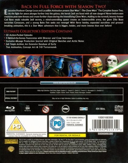 Executive Producer George Lucas and Lucasfilm Animation present Star Wars™: The Clone Wars™ The Complete Season Two. As the fight for peace plunges further into the galaxy, the heroic Jedi are faced with all new dangers! Never-before-seen creatures pose new threats and create further chaos during the intensifying Clone Wars. Adding to teh turmoil, bounty hunter Cad Bane steals valuable Jedi secrets, a mind-controlling queen creates and indistructable army, the giant Zillo Beast terrorises Coruscant, and a young Boba Fett seeks out revenge! With fierce battles, expanded storylines and ground-breaking animation, this is a Star Wars adventure that is bigger, bolder and more intense than ever before!Episodes:1. Holocron Heist2. Cargo of Doom3. Children of the Force4. Senate Spy5. Landing at Point Rain6. Weapons Factory7. Legacy of Terror8.Brain Invaders9. Grievous Intrigue10. The Deserter11. Light Saber Lost12. The Mandalore Plot13. Voyage of Temptation14. Duchess of Mandalore15. Senate Murders16. Cat and Mouse17. Bounty Hunters18. The Zillo Beast19. The Zillo Beast Strkes Back20. Death Trap21. R2 Come Home22. Lethal Trackdown
