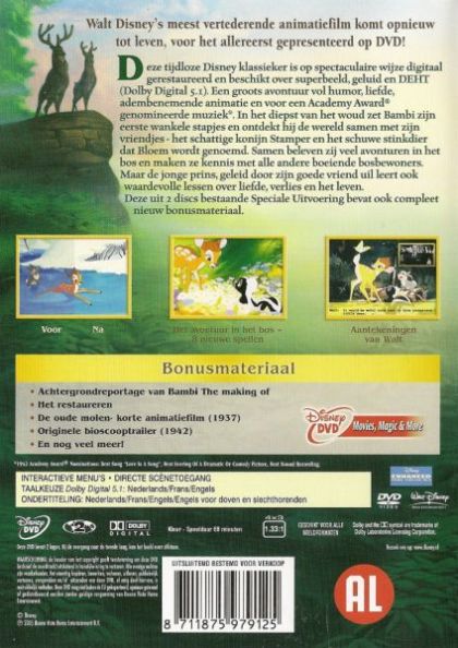Walt Disney's meest vertederende animatiefilm komt opnieuw tot leven, voor het allereerst gepresenteerd op DVD!Deze tijdloze Disney klassieker is op spectaculaire wijze digitaal gerestaureerd en beschikt over superbeeld, geluid en DEHT (Dolby Digital 5.1). Een groots avontuur vol humor, liefde, adembenemende animatie en voor een Academy Award® genomineerde muziek*. In het diepst van het woud zet Bambi zijn eerste wankele stapjes en ontdekt hij de wereld samen met zijn vriendjes - het schattige konijn Stamper en het schuwe stinkdier dat Bloem wordt genoemd. Samen beleven zij veel avonturen in het bos en maken ze kennis met alle andere boeiende bosbewoners. Maar de jonge prins, geleid door zijn goede vriend uil leert ook waardevolle lessen over liefde, verlies en het leven.Deze uit 2 discs bestaande Speciale Uitvoering bevat ook compleet nieuw bonusmateriaal.*1942 Academy Award® Nominations: Best Song "Love Is A Song", Best Scoring Of A Dramatic Or Comedy Picture, Best Sound Recording.