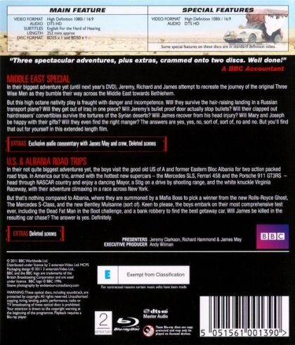Middle East SpecialIn their biggest adventure yet (until next year’s DVD), Jeremy, Richard and James attempt to recreate the journey of the original Three Wise Men as they bumble their way across the Middle East towards Bethlehem.But this high octane nativity play is fraught with danger and incompetence. Will they survive the hair raising landing in a Russian transport plane? Will they get out of Iraq in one piece? Will Jeremy’s bullet proof door actually stop bullets? Will their clapped out hairdressers’ convertibles survive the tortures of the Syrian deserts? Will James recover from his head injury? Will Mary and Joseph be happy with their gifts? Will they even find the right manger? The answers are yes, yes, no, sort of, sort of, no and no. But you’ll find that out for yourself in this extended length film. The USA and Albania Road TripsIn their not quite biggest adventures yet, the boys visit the good old US of A and former Eastern Bloc Albania for two action packed road trips. In America our trio, armed with the hottest new supercars - the Mercedes SLS, Ferrari 458 and the Porsche 911 GT3RS – head through NASCAR Country and enjoy a dancing Mayor, a Stig on a drive by shooting range, and the white knuckle Virginia Raceway, with their adventure climaxing in a race across New York. But that’s nothing compared to Albania, where they are summoned by a MAFIA Boss to pick a winner from the new Rolls Royce Ghost, The Mercedes S Class, and the new Bentley Mulsanne (sort of). Keen to please, the boys embark on their most comprehensive test ever, including the Dead Fat Man in the Boot challenge, and a bank robbery to find the best getaway car. Will James be killed in the resulting car chase? The answer is yes. Definitely.