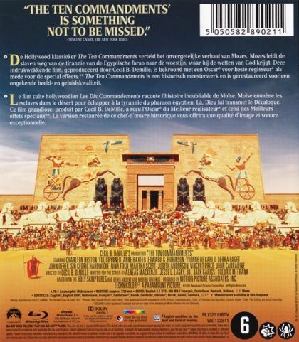 De Hollywoodklassieker The Ten Commandments vertelt het onvergetelijke verhaal van Mozes (Charlon Heston). Mozes leidt de slaven weg van de tirannie van de Egyptische farao naar de woestijn, waar hij van God de Tien Geboden krijgt. Deze indrukwekkende film, geproduceerd door Cecil B. DeMille, is bekroond met een Oscar voor beste regisseur* alsmede voor de special effects. The Ten Commandments is een historisch meesterwerk en is gerestaureerd voor een ongekende beeld- en geluidskwaliteit.