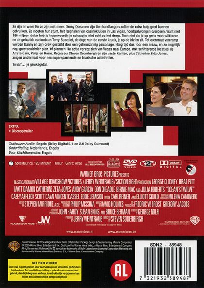 Ze zijn er weer. En ze zijn met meer. Danny Ocean en zijn tien handlangers zullen de extra hulp goed kunnen gebruiken. Ze moeten hun stunt, het leeghalen van casinokluizen in Las Vegas, noodgedwongen overdoen. Want met 160 miljoen dollar heb je tegenwoordig je schaapjes niet echt op het droge. Toch niet als je op grote voet wilt leven en de gehaaide casinobaas Terry Benedict, de dupe van de eerste kraak, je op de hielen zit. Tot overmaat van ramp worden Danny en zijn crew gestalkt door een geheimzinnig personage. Hoog tijd dus voor een nieuw, en zo mogelijk nog spectaculairder plan. Of plannen. De actie verlegt zich van Vegas naar Europa, met schitterende locaties als Amsterdam, Parijs en Rome. Regisseur Steven Soderbergh en zijn vaste klanten, plus Catherine Zeta-Jones, zorgen andermaal voor een superspannende en hilarische actiethriller.Twaalf... je geluksgetal.