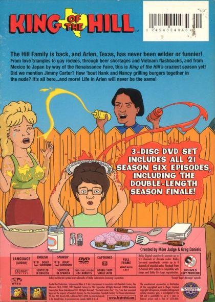 The Hill Family is back, and Arlen, Texas, has never been wilder or funnier!From love triangles to gay rodeos, through beer shortages and Vietnam flashbacks, and from Mexico to Japan by way of the Renaissance Faire, this is King of the Hill's craziest season yet! Did we mention Jimmy Carter? How 'bout Hank and Nancy grilling burgers together in the nude? It's all here...and more! Life in Arlen will never be the same!Episodes:1. Bobby Goes Nuts2. Soldier of Misfortune3. Lupe's Revenge 4. The Father, the Son, and the J.C.5. Father of the Bride6. I'm With Cupid7. Torch Song Hillogyjoust Like a Woman8. The Bluegrass is Always Greener9. The Substitute Spanish Prisoner10. Unfortunate Son11. Are You There God? It's Me, Margaret Hill12. Tankin' it to the Streets13. Of Mice and Little Green Men14. Man Without a Country Club15. Beer and Loathing16. Fun With Jane and Jane17. My Own Private Rodeo18. Sug Night19. Dang Ol' Love20. Returning Japanese (Parts 1&2)