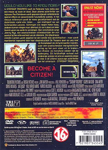 In STARSHIP TROOPERS heeft de Federatie hulp nodig voor een missie op leven en dood. Deze ultieme actie-thriller van regisseur Paul Verhoeven wordt geprezen door de verbijsterende special effects en geavanceerde futuristische scènes. In het nieuwe millennium wordt de mens geconfronteerd met de dodelijkste vijand aller tijden ..... een intelligent ras van buitenaardse wezens. Sommige zijn negen meter hoog, anderen kunnen vliegen maar allemaal zijn ze in staat om ieder levend wezen op aarde te vernietigen. Dan verschijnt de jonge Johnny Rico, een onverschrokken vrijheidsstrijder die zich aansluit bij een elite-eenheid van de infanterie. Zijn bloedmooie vriendin Carmen wordt opgeleid tot een eerste klas gevechtspiloot - maar wordt tegelijkertijd ingepalmd door haar vlieginstructeur! De Troopers gaan op weg naar de thuisplaneet van de buitenaardse insecten, waar een grootscheepse intergalactische oorlog op het punt staat uit te breken. Hun missie: de mensheid redden van de ondergang. Dit heldhaftige verhaal met zinderende scènes vol actie en spanning sleept je mee in dé ultieme space-age actie-thriller van het universum - STARSHIP TROOPERS!