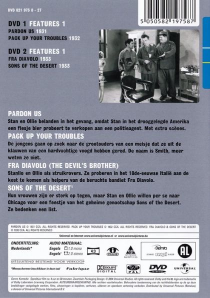 PARDON US (1931)Stan en Ollie belanden in het gevang, omdat Stan in het drooggelegde Amerika een flesje bier probeert te verkopen aan een politieagent. Met extra scenes.PACK UP YOUR TROUBLES (1932)De jongens gaan op zoek naar de grootouders van een meisje dat ze uit de klauwen van een hardvochtige man voogd hebben gered. De naam is Smith, meer weten ze niet.FRA DIAVOLO (THE DEVILS BROTHER) (1933)Stanlio en Olio als struikrovers. Ze proberen in het 18de-eeuwse Italië aan de kost te komen als helpers van de beruchte bandiet Fra Diavolo.SONS OF THE DESERT (1933) Hun vrouwen zijn er sterk op tegen, maar Stan en Ollie willen per se naar Chicago voor een feestje van het geheime genootschap Sons of the Desert. Ze bedenken een list.
