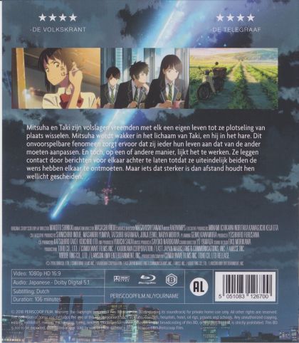 High schoolers Mitsuha and Taki are complete strangers living separate lives. But one night, they suddenly switch places. Mitsuha wakes up in Taki’s body, and he in hers. This bizarre occurrence continues to happen randomly, and the two must adjust their lives around each other.