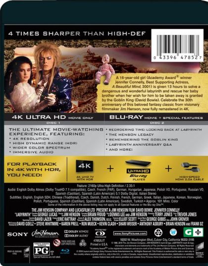 Frustrated with babysitting on yet another weekend night, Sarah, a teenager with an active imagination, summons the Goblins to take her baby stepbrother away. When little Toby actually disappears, Sarah must follow him into a fantastical world to rescue him from the Goblin King. Guarding his castle is the labyrinth itself, a twisted maze of deception, populated with outrageous characters and unknown dangers.