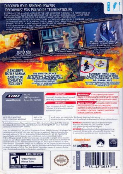 The Last Airbender video game revisits captivating, climactic scenes from the film while providing the player a much more indepth experience. The game is told from the unique perspective of the antagonist Zuko, exiled prince of the Fire Nation, who embarks on a personal quest to capture the Avatar, a young boy named Aang, in order to regain his father's honor. Players will be able to embody three playable characters - Aang, Zuko and the Blue Spirit - and participate in epic battles, hand-to-hand combat and various intense challenges throughout the game. Utilizing the Wii Remote and Nunchuk, players will discover and master their bending powers by performing special hand movements that are specific to their character's abilities. The interactive, action adventure game, will allow players to learn how to manipulate air and fire, creating destructive forces such as Air Vortexes, Tornadoes, Fire Balls, and Fire Bombs, to take down enemies and progress through the game in order to fulfill their destiny.