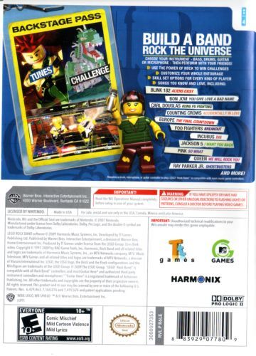LEGO Rock Band merges two of the most popular videogame franchises to deliver a unique family-friendly music experience that will take tweens, teens, families and gamers of all ages on a wild journey to rock stardom in order to "Build a Band and Rock the Universe." Combining the authentic multiplayer music experience of Rock Band with the accessibility, customization and humor of LEGO games, LEGO Rock Band allows players to create their own unique rock star style and customize their own avatars, band members, roadies, and managers. As players successfully complete songs and rock challenges, they can collect LEGO studs, unlock additional content and collect amazing vehicles, which can take their band from local gigs at rock clubs to epic stadium shows and even fantasy settings on Earth and beyond.