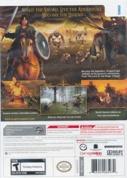 The Lord of the Rings: Aragorn's Quest is the first videogame offering an authentic The Lord of the Rings gameplay experience designed for all ages to enjoy together. For the first time ever, The Lord of the Rings comes to the Wii, taking full advantage of the Wii-mote and Nunchuck – delivering action-packed motion-controlled gameplay.
