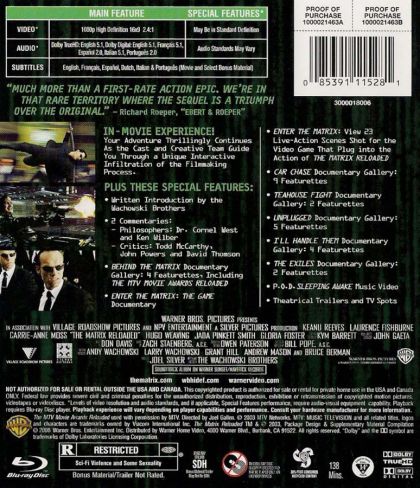 In this second chapter of the "Matrix" trilogy, Neo assumes greater command of his extraordinary powers as Zion falls under siege to the Machine Army. Only a matter of hours separates the last human enclave on Earth from 250,000 Sentinels programmed to destroy mankind. But the citizens of Zion stand firm, emboldened by Morpheus conviction that the One will fulfill the Oracle's Prophecy and end the war...