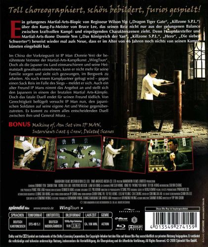 A semi-biographical account of Yip Man, the first martial arts master to teach the Chinese martial art of Wing Chun. The film focuses on events surrounding Ip that took place in the city of Foshan between the 1930s to 1940s during the Second Sino-Japanese War. Directed by Wilson Yip, the film stars Donnie Yen in the lead role, and features fight choreography by Sammo Hung.