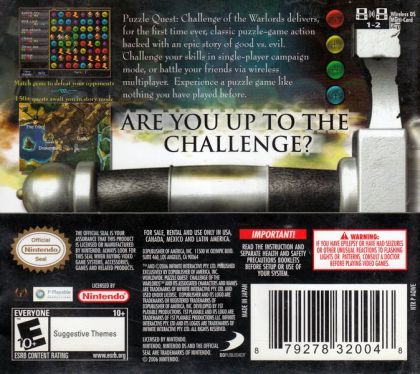 Puzzle Quest: Challenge of the Warlords is a brand new, genre-bending title that ups the ante on traditional puzzle games by incorporating strategy, role-playing elements and a persistent storyline. Set in the Warlords universe, the game challenges players to save the land of Etheria from evil Lord Bane as gamers engage in battles fought by means of competitive, head-to-head "match-three" style puzzle games in one of three gameplay modes: Single-player, Instant Action or Multiplayer. Victory will advance a player's customizable hero, magical arsenal, creature companions and more—ultimately rewarding gamers at nearly every turn and deepening their immersion into the richly diverse world. The game's remarkable mix of classic puzzle gameplay and an abundant suite of characters, customizations, spells, companions, tamable monsters and more provides a fresh take on the puzzle genre that offers endless hours of replayability. Designed specifically for handheld gaming systems, Puzzle Quest can be enjoyed in long or short doses, cultivating a casual but deeply satisfying and compelling gameplay experience.