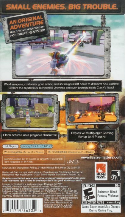 Early next year, get ready for all the firepower players have come to expect from the multi-million unit-selling Ratchet & Clank series in Ratchet & Clank: Size Matters, an all-new sci-fi action adventure made exclusively for the PSP system. Featuring many new and returning weapons and gadgets, Ratchet & Clank: Size Matters will draw players into a galaxy spanning adventure set across new levels with diverse gameplay.