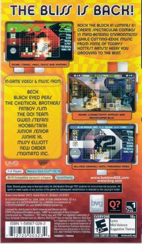Lumines II for the PSP is the highly anticipated sequel to the extremely addictive puzzle-based video game, Lumines. Gamers control squares made of four smaller block pieces that are dropped into the playing field one at a time to form same-color squares. The vertical "timeline" sweeps across the playing field from left to right and wipes the same-color squares from the playing field. Unmatched blocks pile up, and the game ends when the pile gets to the top of the playing screen. Advance through many action-packed levels, each with its own musical theme and sound effects.