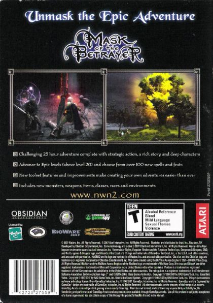 Set in harsh, spirit-rich Rashemen, near the powerful nation of Thay, Neverwinter Nights 2: Mask of the Betrayer presents players with an exciting new 20-30+ hour campaign filled with meaningful choices, rich characters, and surprising outcomes. Continue the adventure of your Neverwinter Nights 2 character or create a completely new epic hero ... no previous Neverwinter Nights experience required. Hundreds of new gameplay options include epic levels; feats, spells, races, and classes; powerful weapons, armour, and crafting options; and hordes of diverse creatures.