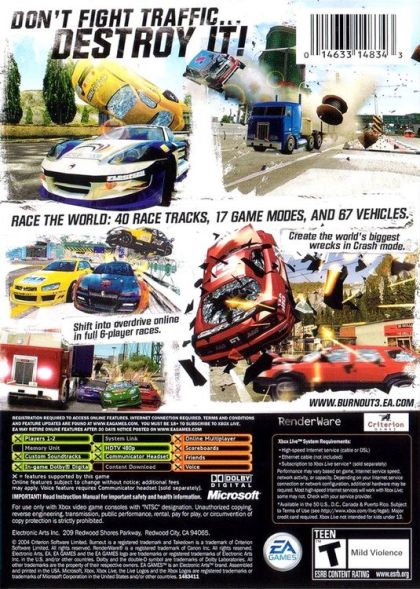 Burnout 3 rewrites the rules of the road and is now driven by a new mantra: Aggressive Racing Required. Racing gamers and adrenaline junkies are invited to get behind the wheel and experience unprecedented speed and action. Use your car as a weapon and battle your way to the front of the pack by taking down rivals and causing spectacular crashes. Vie for first place or indulge your thirst for twisted metal and breathtaking crashes. Live dangerously with a dedicated crash mode that rewards you for creating the most massive pile-ups ever seen in a videogame. With category defining visuals, addictive multiplayer gameplay, and over 100 events spanning 40 tracks, Burnout 3 is a breakneck, adrenaline-fuelled, awe-inspiring racing experience.