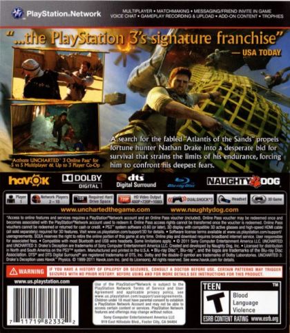 Fans of the franchise and newcomers alike will relish the opportunity to catapult themselves headlong into a real adventure, in a search for the fabled "Atlantis of the Sands." The journey propels fortune hunter Nathan Drake on a daring trek into the heart of the Arabian Desert, a journey that pits him and his mentor Victor Sullivan against the occult treachery of a shadowy clandestine organization and its ruthless leader. When the terrible secrets of this lost city are unearthed, Drake's quest descends into a desperate bid for survival that strains the limits of his endurance and forces him to confront his deepest fears.