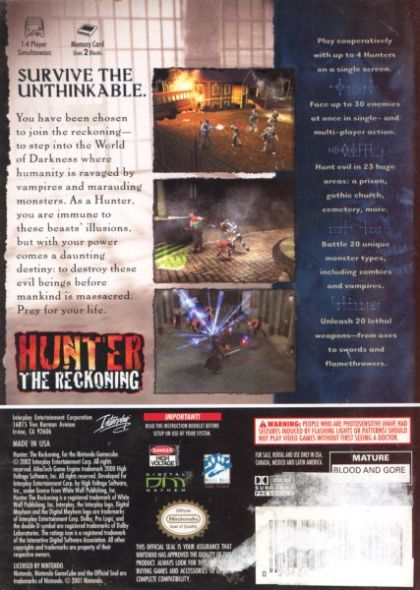 Set in White Wolf's World of Darkness, Hunter: The Reckoning is a third-person action-shooter where players take the role of one of four unique hunters - Deuce, a biker ex-con, Father Cortez, a prison chaplain, Kassandra, a raver chick and Samantha, a tough ex-cop. Armed with a variety of fearsome weaponry, players will battle it out with a plethora of supernatural enemies. Non-stop heart-pumping action, combined with outstanding graphics bring the true spirit of Hunter: The Reckoning to life, and give players a taste of the World of Darkness.
