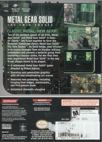 Solid Snake debuts on Nintendo's GameCube in Metal Gear Solid The Twin Snakes. After achieving worldwide sales success and awards for both the original Metal Gear Solid and Metal Gear Solid 2: Sons Of Liberty, series creator, Hideo Kojima combines the essence of both games into one unique experience.