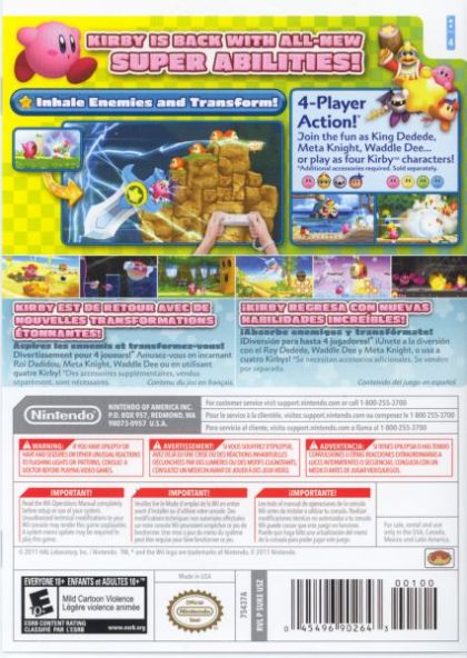 Kirby and his friends are back in an adventure designed to satisfy longtime Kirby fans and beginners alike. When an alien spaceship crashes in the otherwise peaceful realm of Pop Star, its pieces are scattered throughout the land. Players must guide Kirby as he retrieves the ship's parts and helps the aliens return to their home planet. This time, however, he's not alone. At any time, up to three more players can join in the fun and play as Meta Knight, King Dedede and Waddle Dee to help Kirby in his quest.