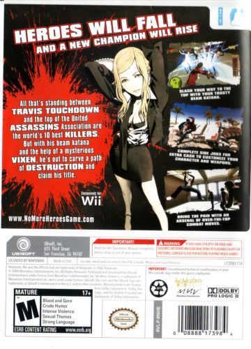 No More Heroes tells the story of Travis Touchdown, an anime fan who lives in the fictional town of Santa Destroy, California. After an unexpected turn of events, Travis finds himself at the bottom of an Assassins' organization. Travis will have to prove himself worthy and defeat 10 other bloodthirsty killers - all with deep stories of their own - to make his way to the top of the assassins league.
