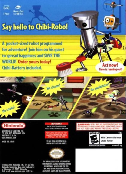 For her eighth birthday, little Jenny receives a very strange gift from her toy-fanatic father – a little robot named Chibi-Robo. But Jenny's mother isn't happy, because Jenny's father has just quit his job at a robotics plant for reasons he won't explain. Chibi-Robo helps around the house, cleaning up and doing whatever he can to bring happiness to this troubled family. When the robotic Spydorz show up, it's up to Chibi-Robo to protect his family from the evil plans of Macroware Robotics, Inc.