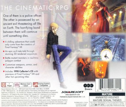 A police drama delves into the supernatural when a monstrous force threatens the world at the sub-cellular level. Based on the Japanese science fiction novel by Hideaki Sena, Parasite Eve features a science-fiction/horror story line told through incredible 3D computer graphic visuals; detailed film-quality story sequences blend seamlessly with the realistic gameplay environments. The motion-picture-style effects complement the intricate storyline based on a best-selling Japanese sci-fi novel.