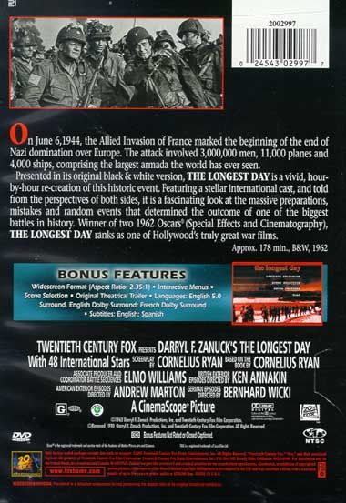 The longest day is D Day. We see the Normandy Invasion in interwoven stories of the combatants. Among the numerous characters are prescient Field Marshall Erwin Rommel (Werner Hinz), tough Lt. Col. Vandervoort (John Wayne), Pvt. Flanagan (Sean Connery), Brig. Gen. Cota (Robert Mitchum), Theodore Roosevelt Jr.(Henry Fonda), and unpleasant Flight Officer Campbell (Richard Burton). The film shows the landing on the beaches, and the fighting farther inland where the paratroopers have landed. The plight of the French is well portrayed as their country becomes the battleground. The films shows the fighting from the points of view of both sides, and shows the Allies as taking advantage of the poor preparation of the Germans.