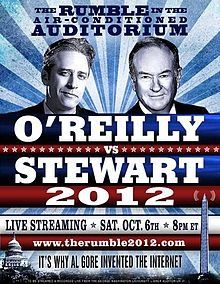 Bill O'Reilly, Jon Stewart, 2 podiums,1 Air-Conditioned Auditorium: In "O'Reilly vs. Stewart 2012: The Rumble in the Air-Conditioned Auditorium," O'Reilly & Stewart take an entertaining and comedic approach to today's pressing political issues, in an attempt to find the best direction for America. The debate, which was streamed live online, was recorded on Saturday, October 6th, 2012, at the Lisner Auditorium at The George Washington University, in Washington, D.C. The proceeds from the sale of the debate go to multiple charities picked by both O'Reilly & Stewart, including the Fisher House Foundation, Doctors Without Borders, and the USO.